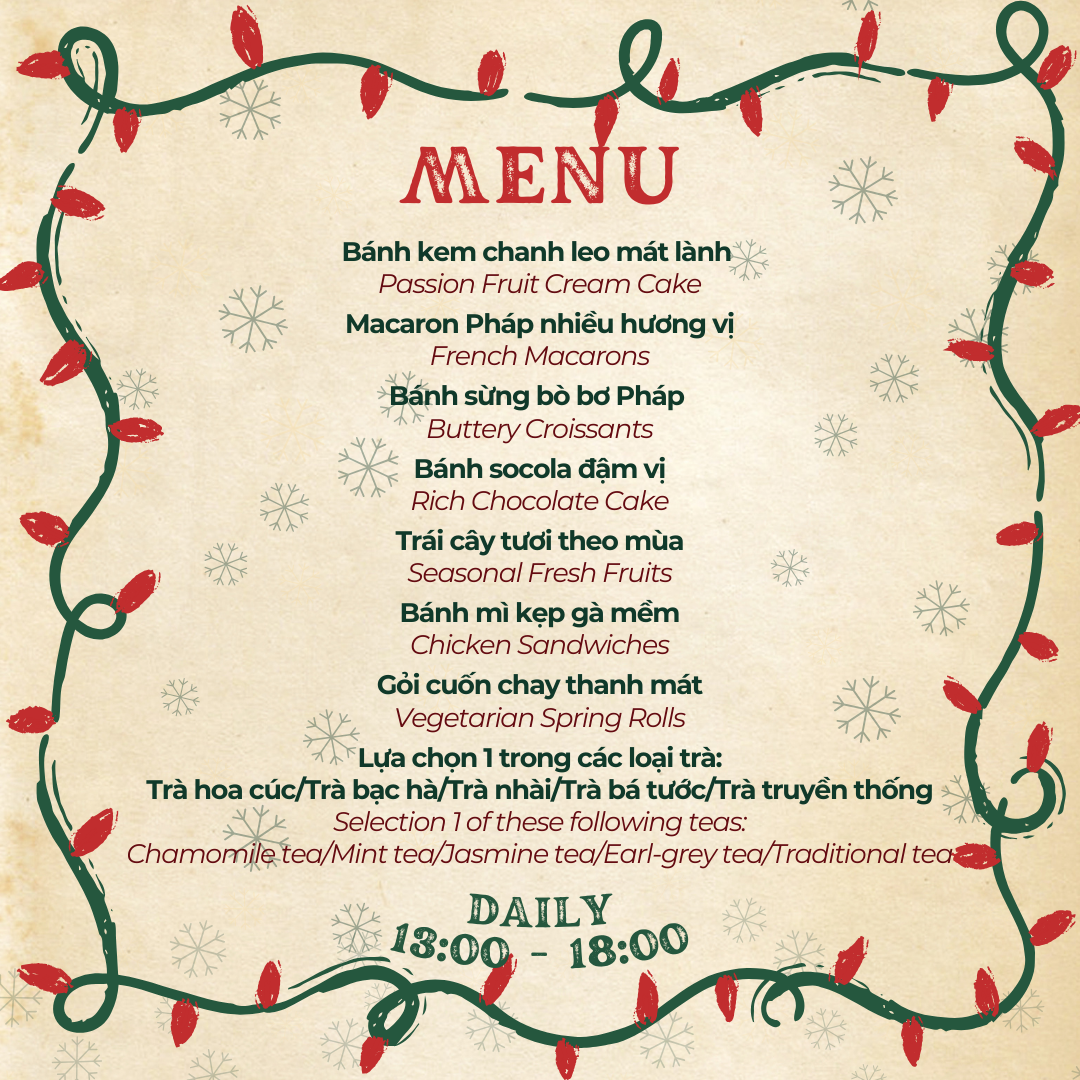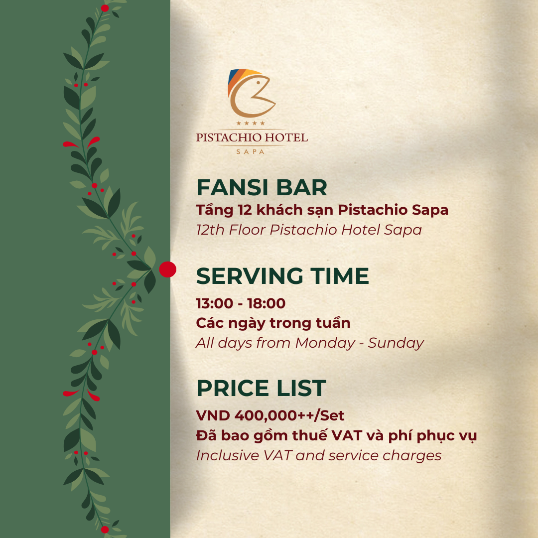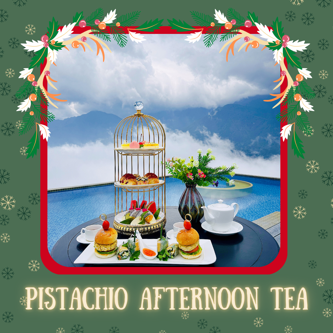 Enjoy a Christmas Afternoon Tea on the rooftop of Pistachio Hotel Sapa, where you can sip fragrant tea while admiring the infinity pool view and gazing out over the majestic Muong Hoa Valley. A peaceful, elegant, and inspiring afternoon amid the clouds and sky of the Northwest. Eye-catching colors from various sweets, fruits will make you really relaxed and impressive.